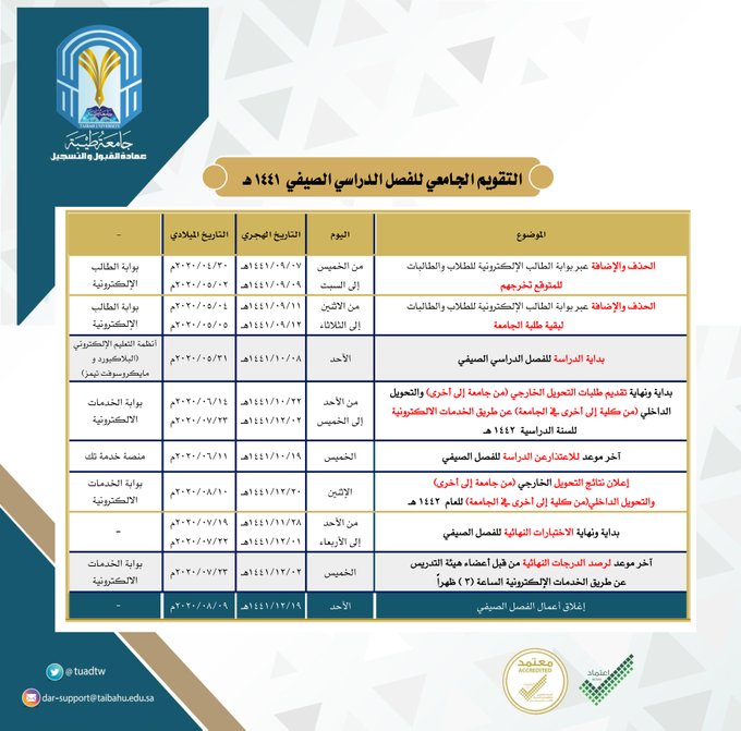 جامعة طيبة الكليات كلية الاداب والعلوم الانسانية بينبع التقويم الجامعي التقويم الجامعي 1441 هـ